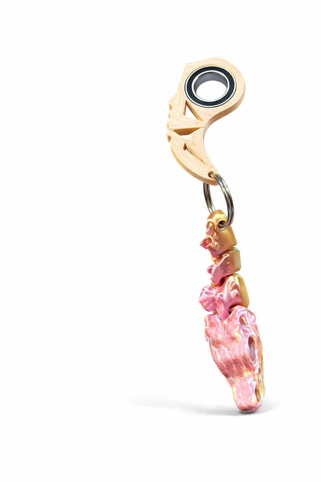 Unikalny keyspinner wykonany w technologii druku 3D, połączony z efektowną, artystyczną zawieszką w połyskującym wykończeniu. Lekka konstrukcja oraz wbudowane łożysko pozwalają na płynne obracanie na palcu, co czyni go idealnym gadżetem antystresowym na co dzień.